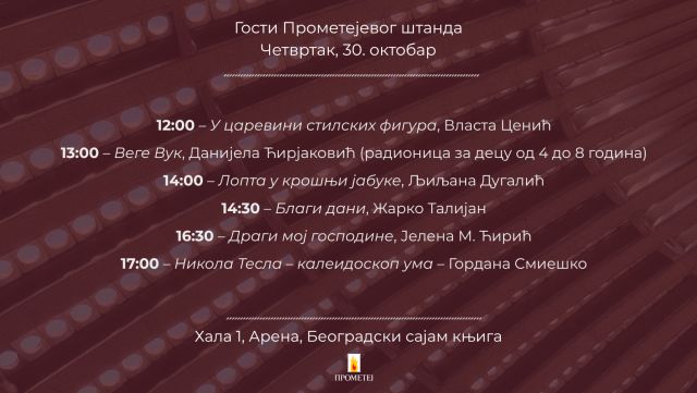 Dođite da upoznate autora/autorku, razmislite o novim naslovima, uživate u razgovorima i, naravno, nabavite svoje primerke.