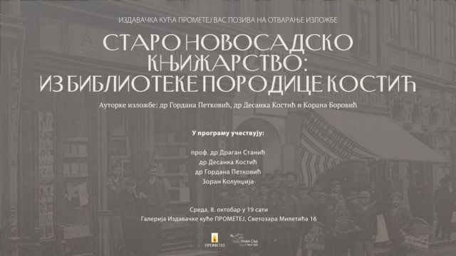 Kroz izložbu “Staro novosadsko knjižarstvo – iz biblioteke porodice Kostić“ autorki dr Gordane Petković, dr Desanke Kostić i Korane Borović u galeriji Prometej biće predstavljena zbirka knjiga, fotografija i dokumenata iz privatne biblioteke porodice Kostić.
