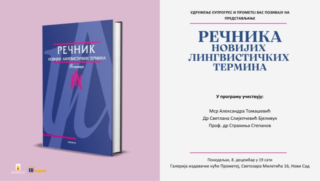 Izdavačka kuća Prometej i EUProgres vas pozivaju na predstavljanje knjige Rečnika novijih lingvističkih termina, u ponedeljak, 8. decembra, u 19 sati u galeriji Prometej (Svetozara Miletića 16, Novi Sad).
