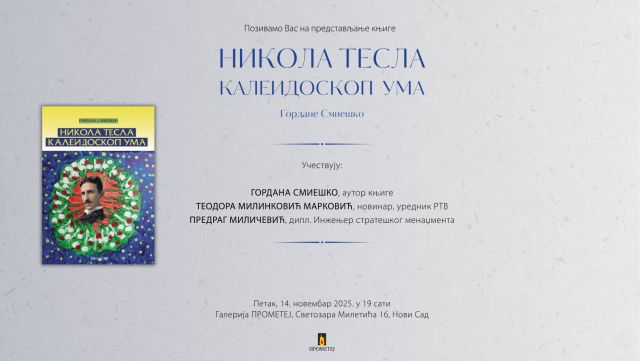Izdavačka kuća Prometej vas poziva na promociju zbirke pesama Gordane Smieško “Nikola Tesla – kaleidoskop uma” u petak, 14. novembra, u 19 sati u galeriji Prometej (Svetozara Miletića 16, Novi Sad).