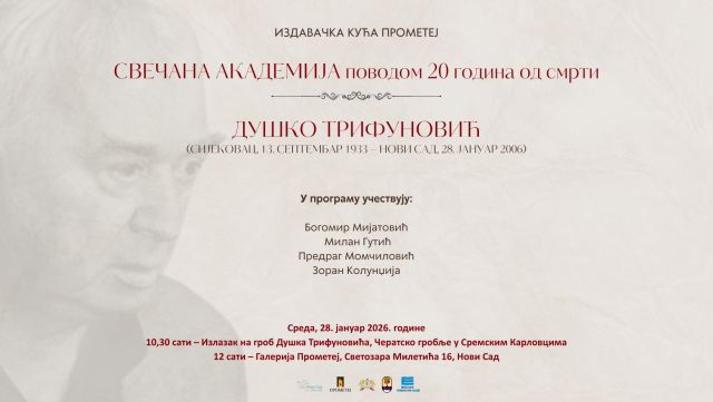 Povodom obeležavanja 20 godina od smrti velikog pesnika, u sredu, 28. januara, u 12 časova u galeriji Prometej (Svetozara Miletića 16), organizovan je program SEĆANJE NA DUŠKA TRIFUNOVIĆA.