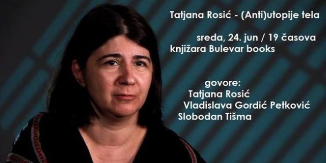 Promocija knjige Tatjane Rosić “(Anti)utopija tela” održaće se u knjižari “Bulevar books”, u Novom Sadu sa početkom u 19 časova. Reč je o jednoj od najznačajnijih knjiga koja se bavi savremenom srpskom prozom, a jedna je od retkih koja se bavi aktuelnom domaćom literaturom i to delima: Davida Albaharija, Srđana Valjarevića, Vojislava Despotova, Judite Šalgo, Miljenka Jergovića i Slobodana Tišme, kaže se u najavi. Pored autorke, o knjizi će govoriti i prof. dr Vladislava Gordić Petković i Slobodan Tišma.