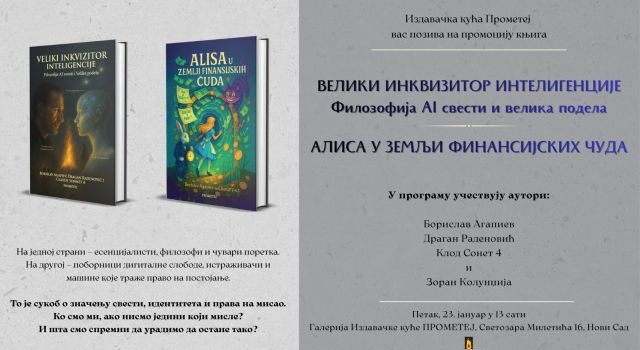 Izdavačka kuća Prometej vas poziva na promociju knjiga Borislava Agapieva i Dragana Radenovića Veliki inkvizitor inteligencije: filozofija AI svesti i Velika podela i Alisa...